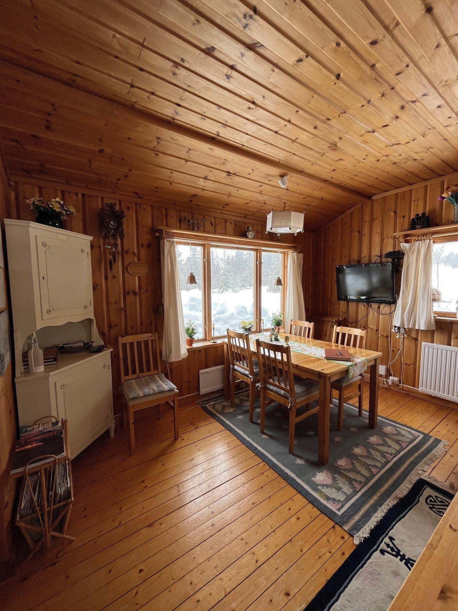 Vardagsrum med matplats, soffgrupp och braskamin. (På den här bilden är det den förra soffgruppen.)