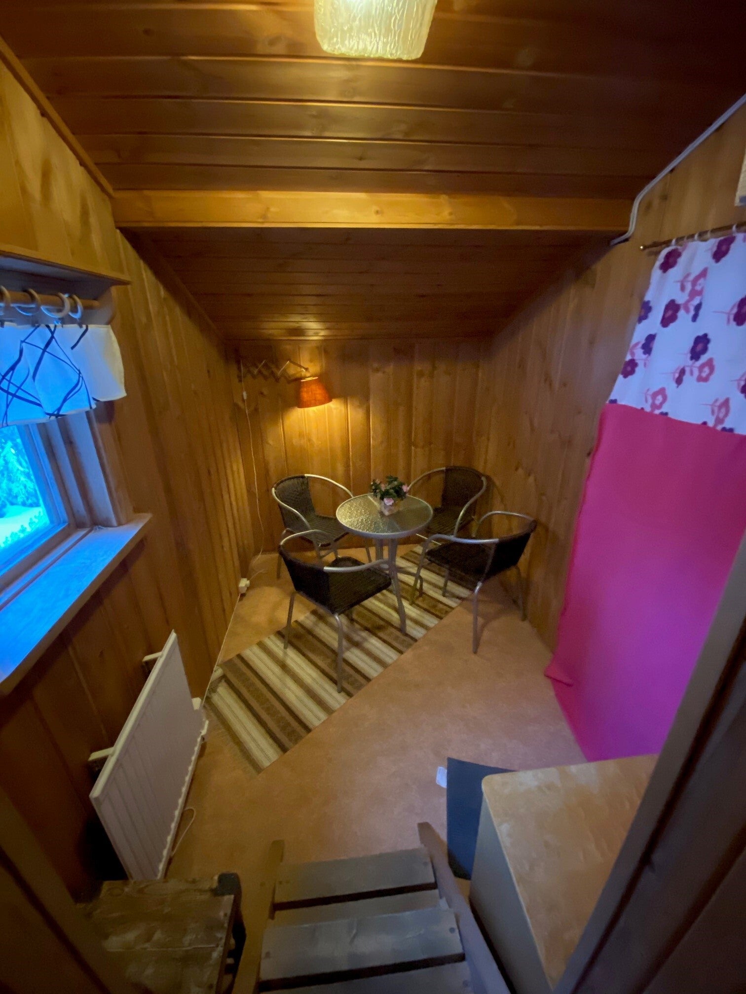 Avsvalningplats att pausa på utanför bastun (bakom det rosa draperiet).
