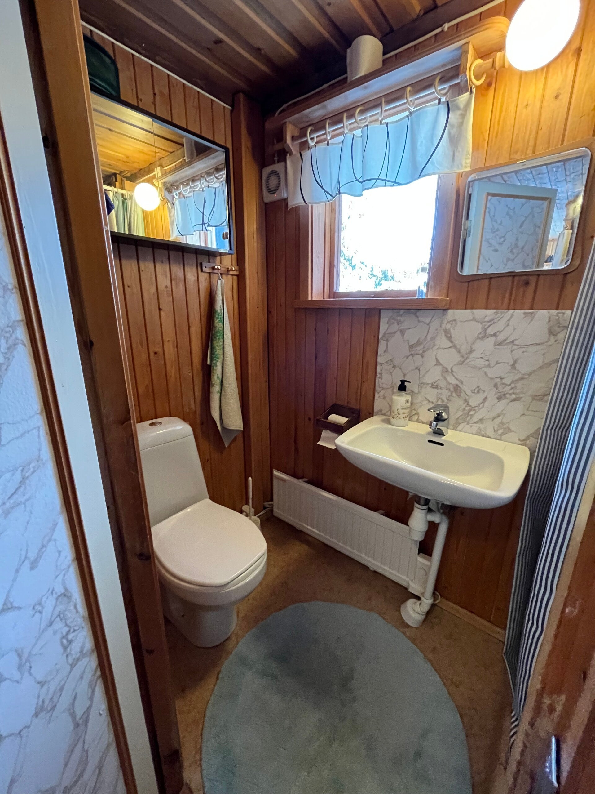 Köket och vy åt höger mot sovrum och badrum/dusch.